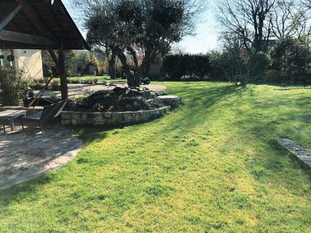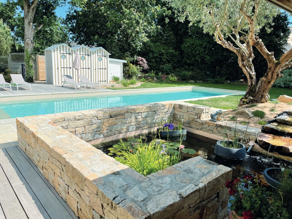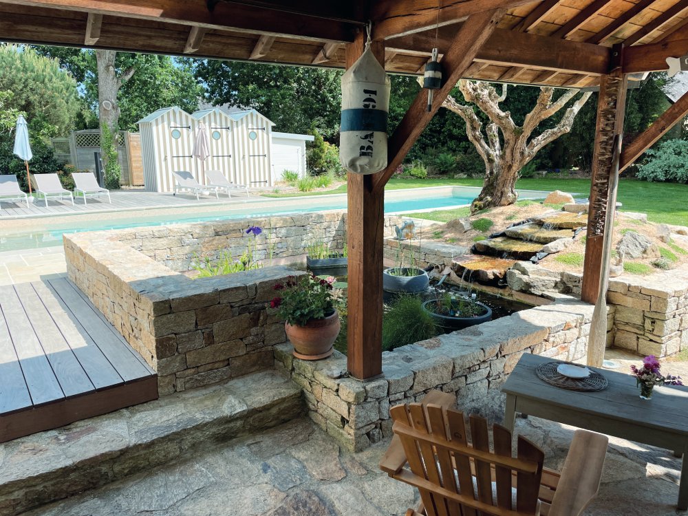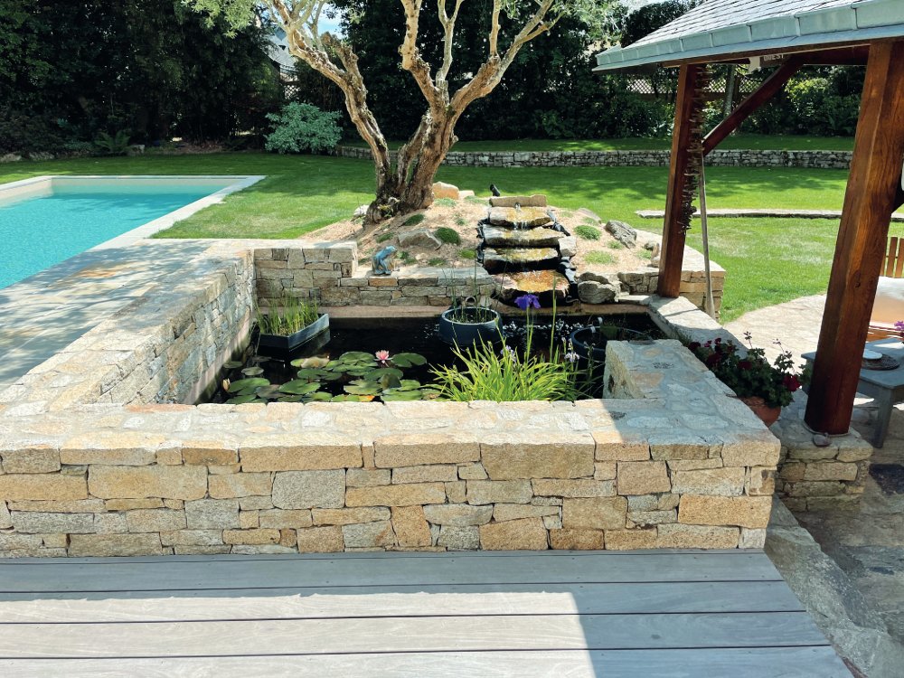 Réalisation d’aménagements paysagers pour cette maison : travaux de terrassement, terrasses en bois ipé sur 3 zones distinctes, habillage des abords de la piscine avec dallage en pierre naturelle, restructuration d’une cascade avec la création d’un muret en pierre granit, clôture en grillage rigide avec occultation en bois, pas japonais, plantations, paillage naturel, engazonnement, installation de 3 cabines de plage afin de créer une ambiance « Bord de mer » et d’éléments d’éclairage extérieur.