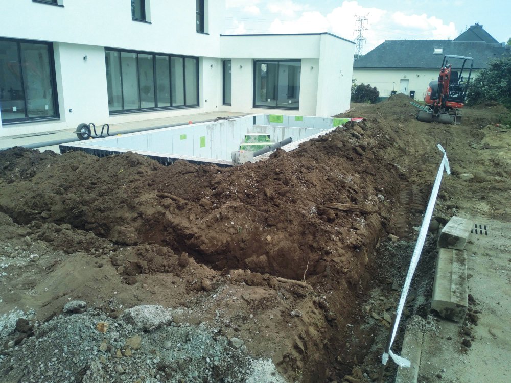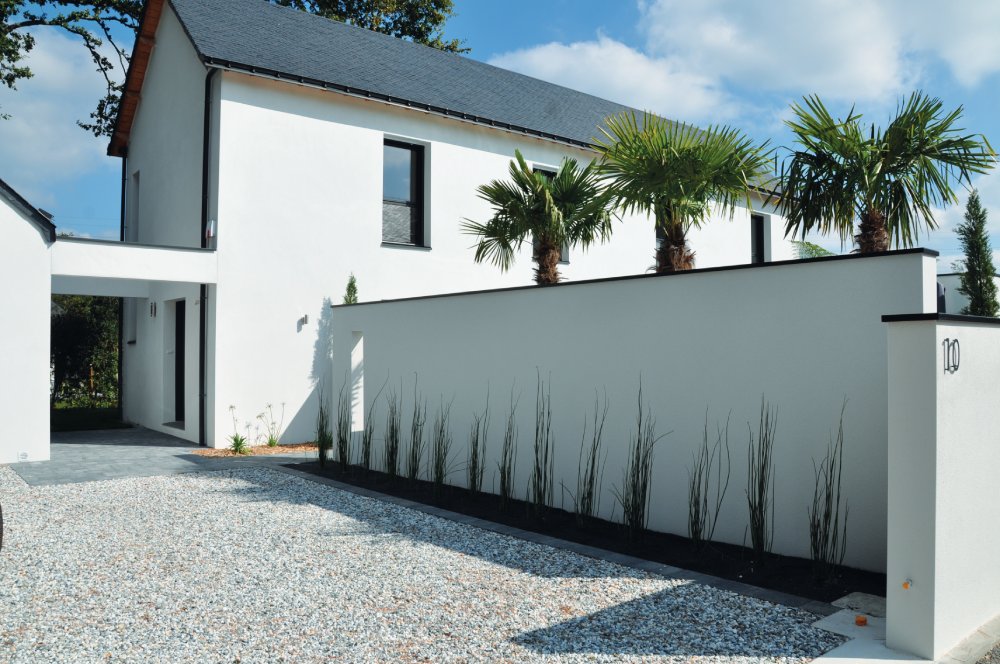 Réalisation de l’aménagement paysager global pour cette maison neuve : travaux de terrassement, dallage, pavage, nidagravel, murets enduits avec couvertine, muret enduit avec palissade en liteaux bois Douglas, muret enduit décoratif avec meurtrière, clôture grillage souple, plantations, gazon de placage, installation d’éléments d’éclairage extérieur et d’une fontaine décorative.