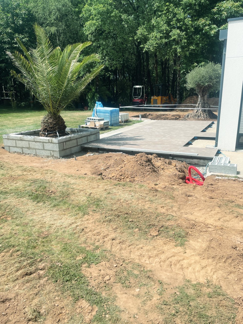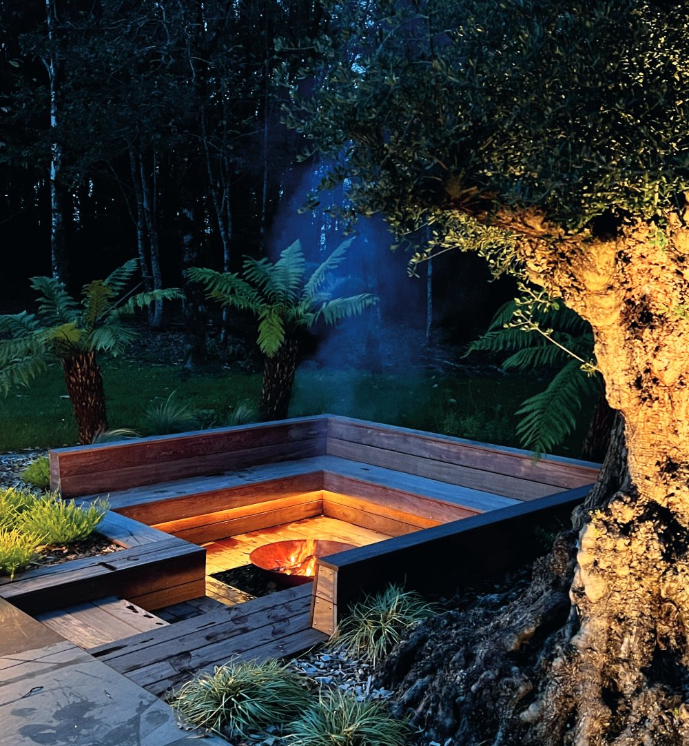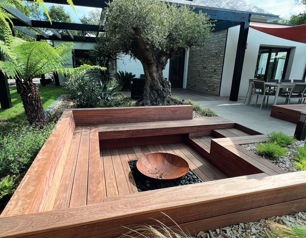 Dans le cadre d’un aménagement paysager global pour cette maison, réalisation d’un coin salon encastré sur mesure de 3x3 m en lames de terrasse bois exotique Cumaru. Véritable lieu d’échange et de convivialité, ce coin salon est équipé d’un éclairage à LED et d’un braséro en acier Corten à son centre pour se réchauffer lors des soirées d’été.