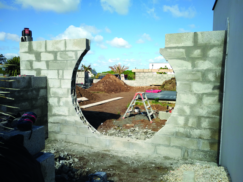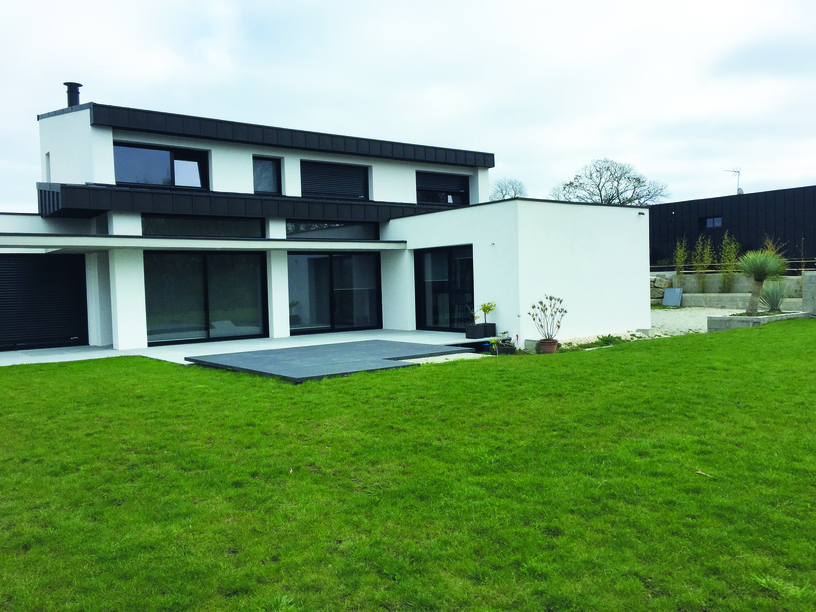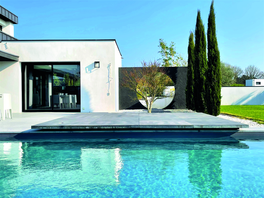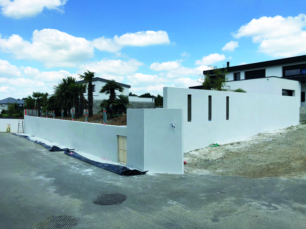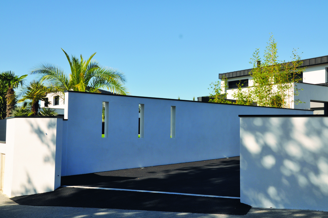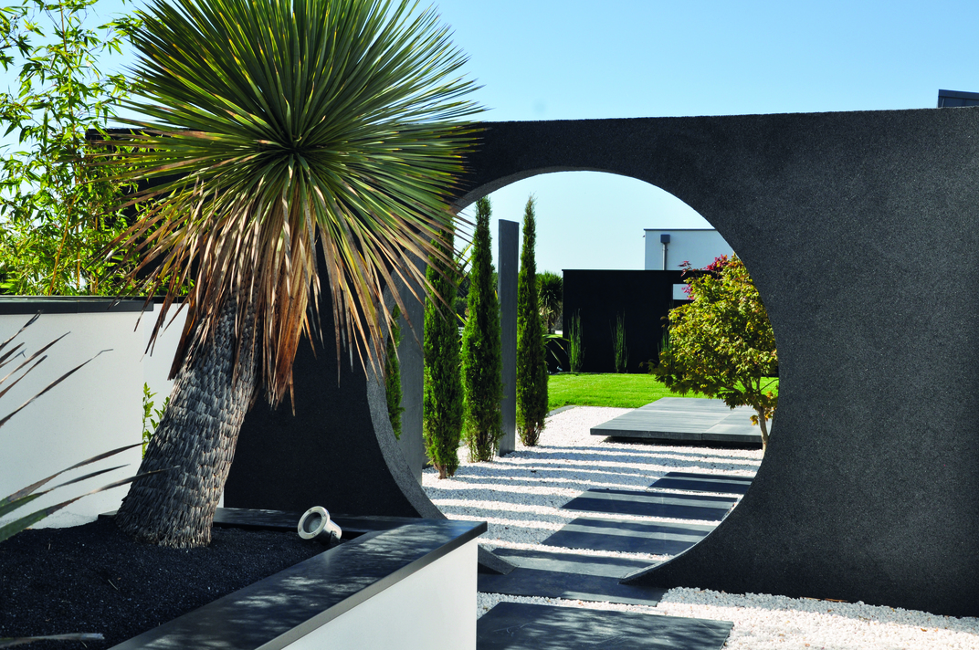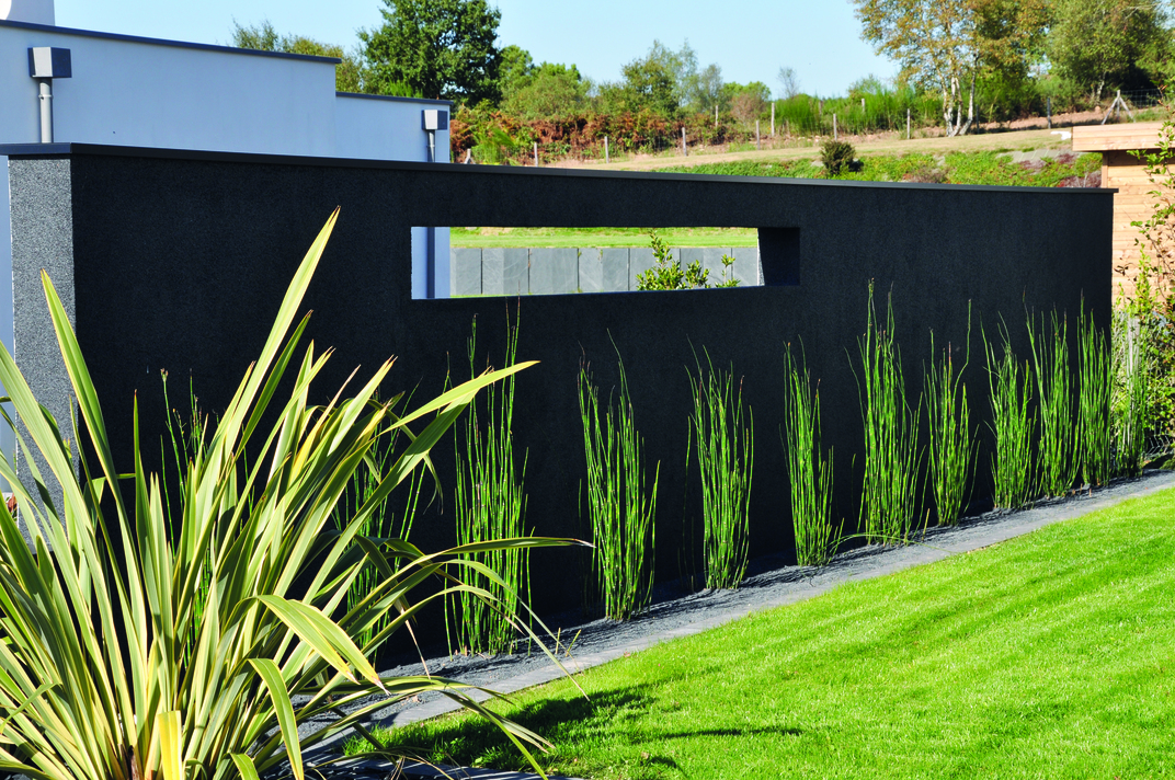 La création du mur d’entrée décoratif en enduit noir avec un rond apporte une singularité à ce projet.