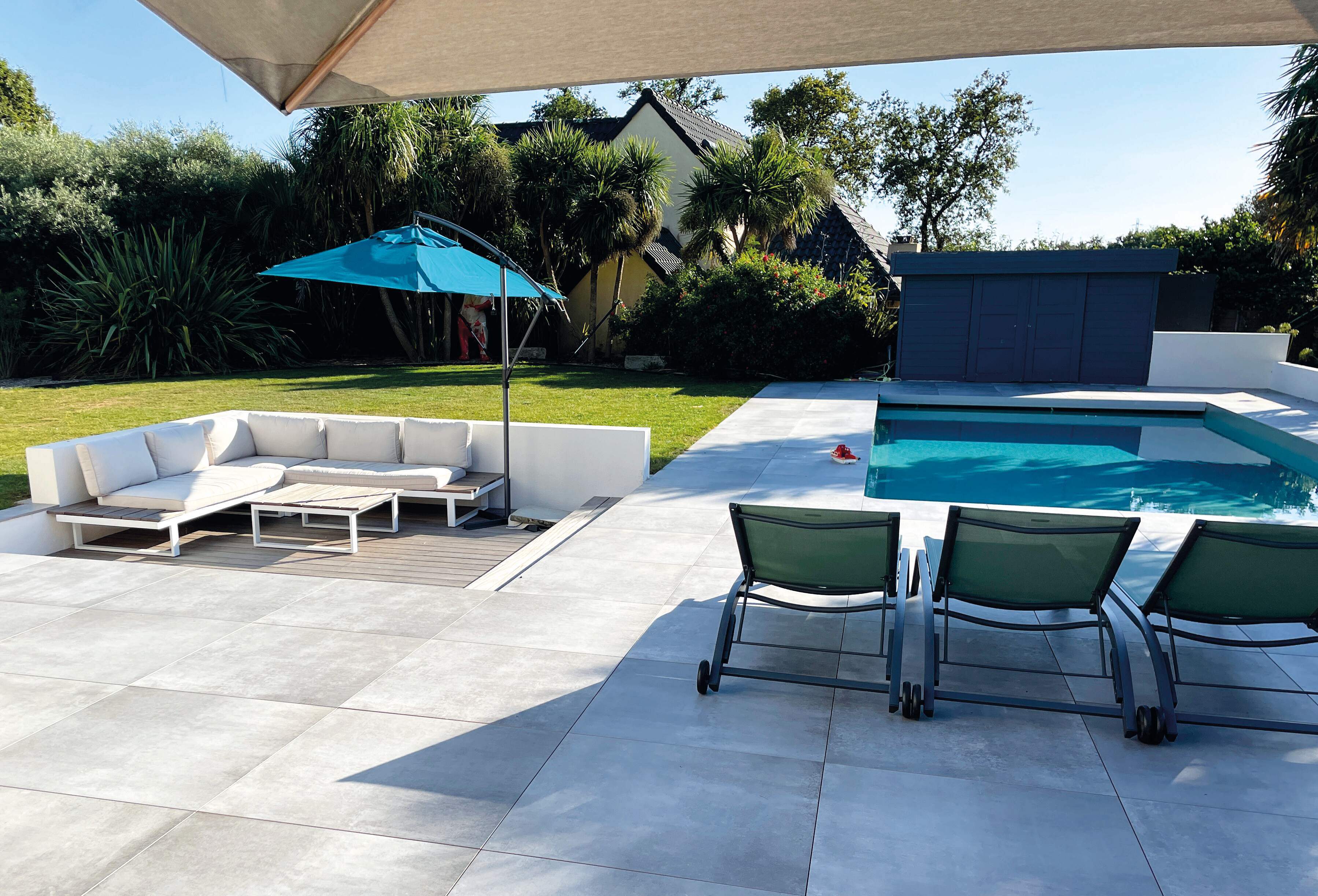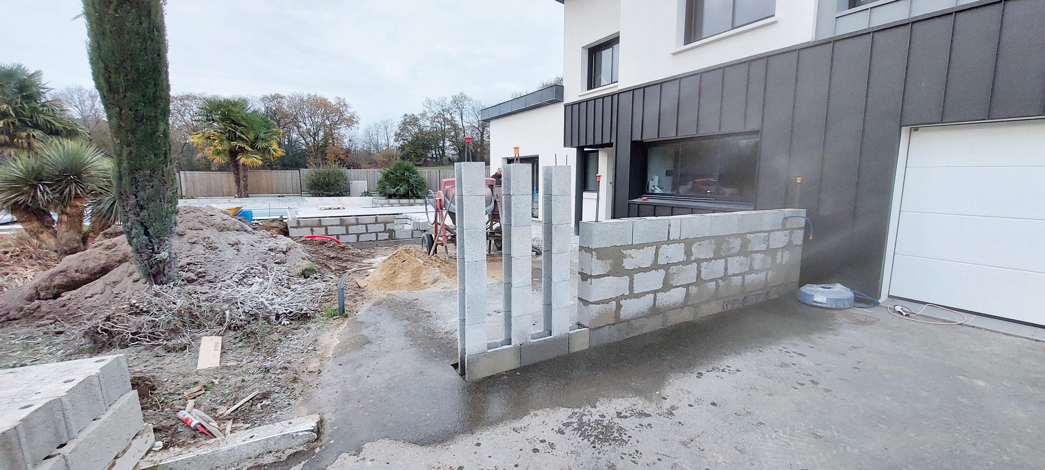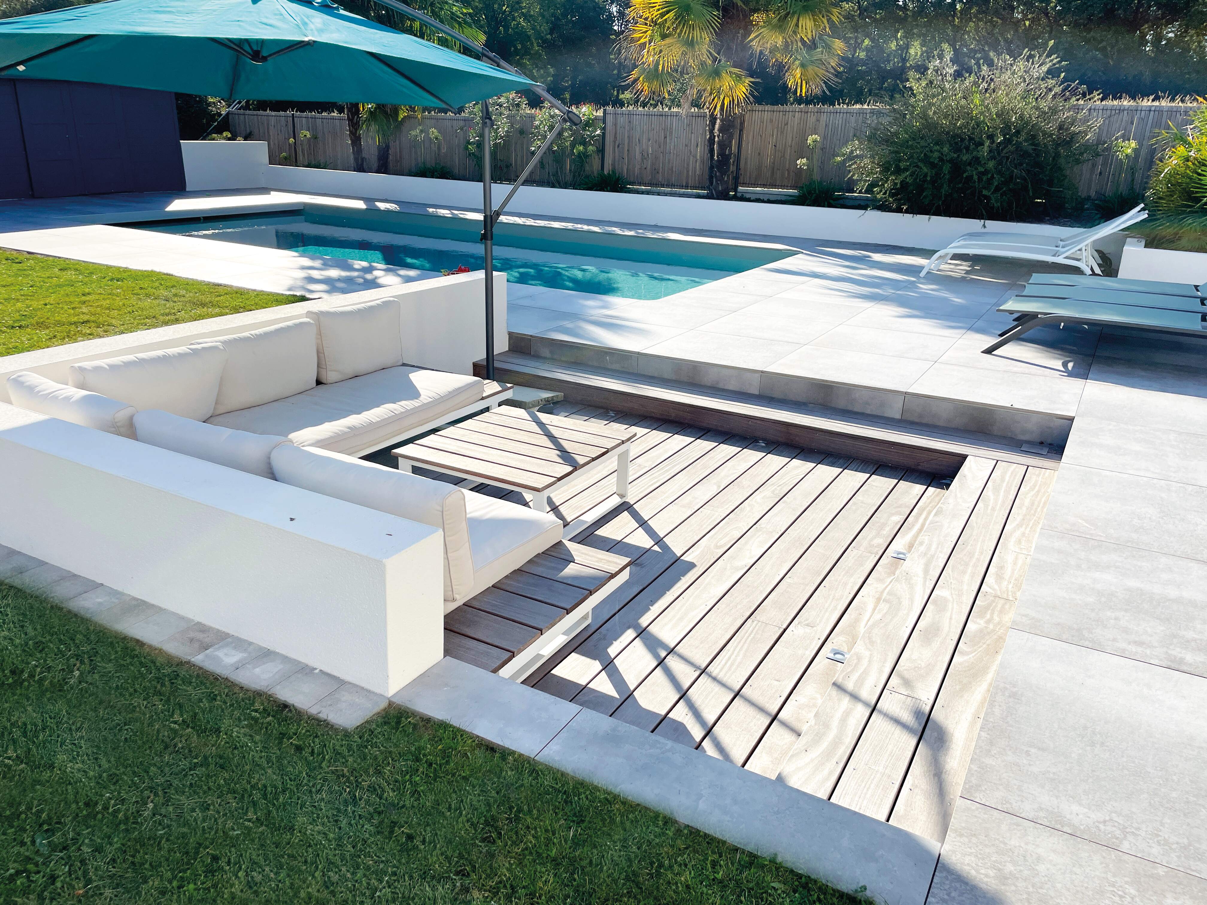 Réalisation de l’aménagement paysager global pour cette maison neuve : pavage entrée, terrasse en dallage céramique, terrasse coin salon encastré en bois Cumaru, muret piscine enduit, murets enduits décoratifs avec couvertine et meurtrières.