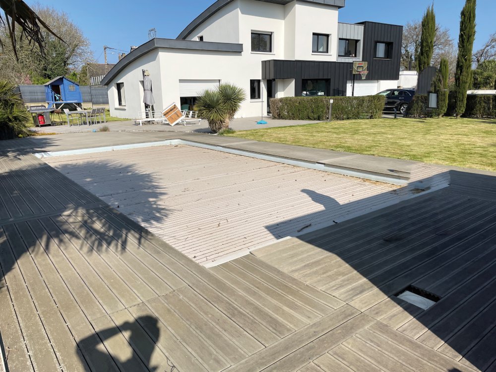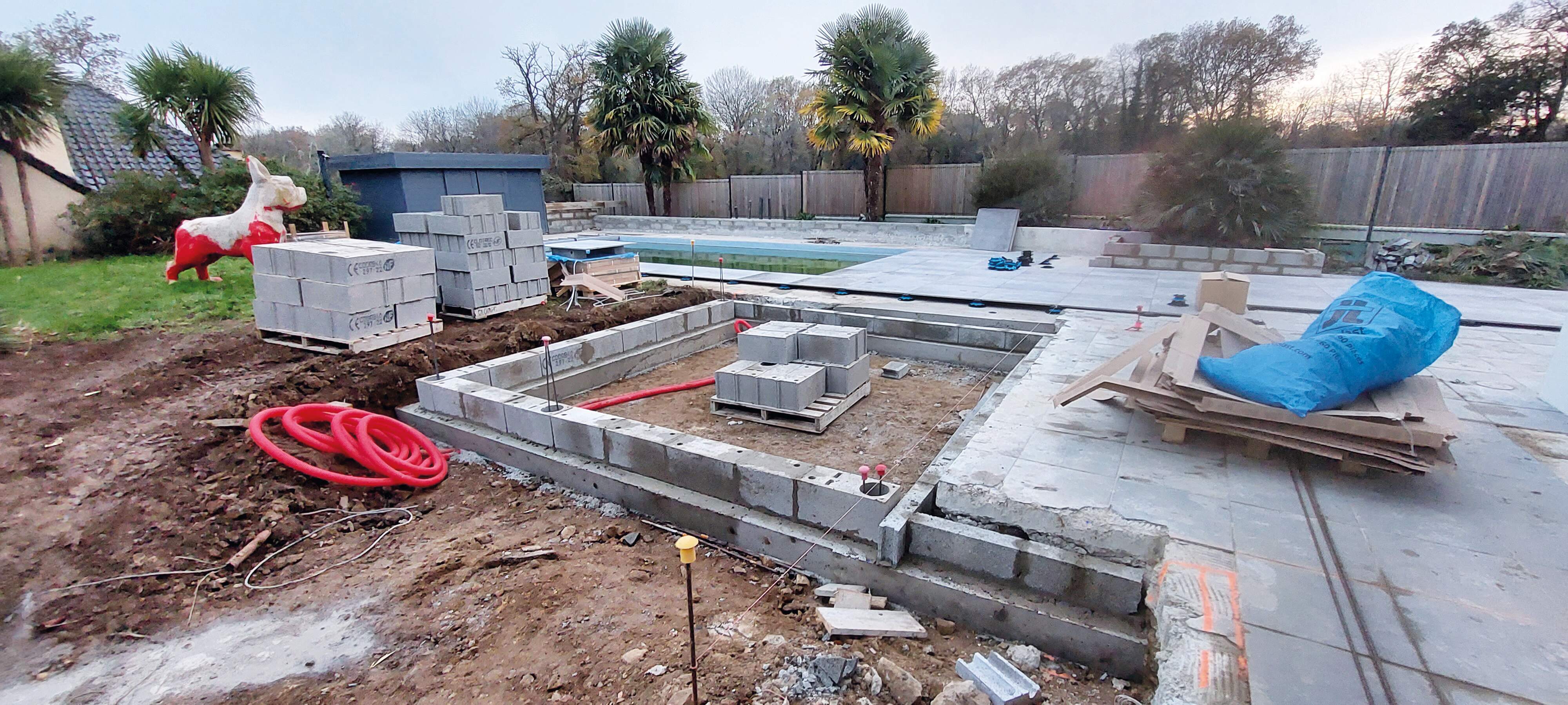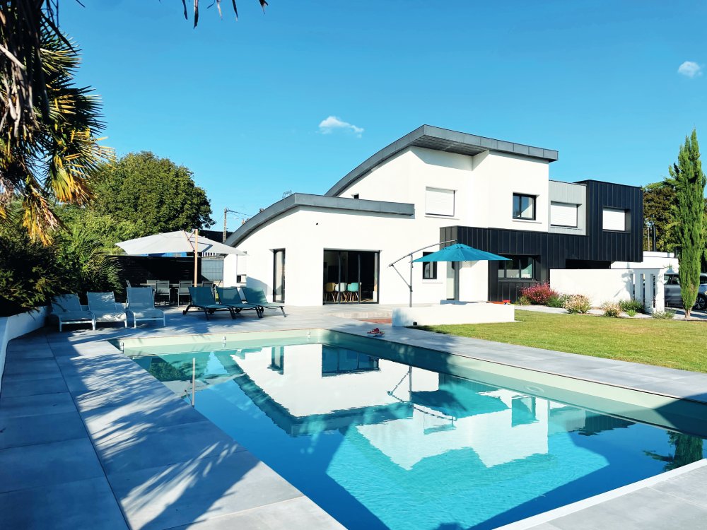 Réalisation de l’aménagement paysager global pour cette maison neuve : pavage entrée, terrasse en dallage céramique, terrasse coin salon encastré en bois Cumaru, muret piscine enduit, murets enduits décoratifs avec couvertine et meurtrières.