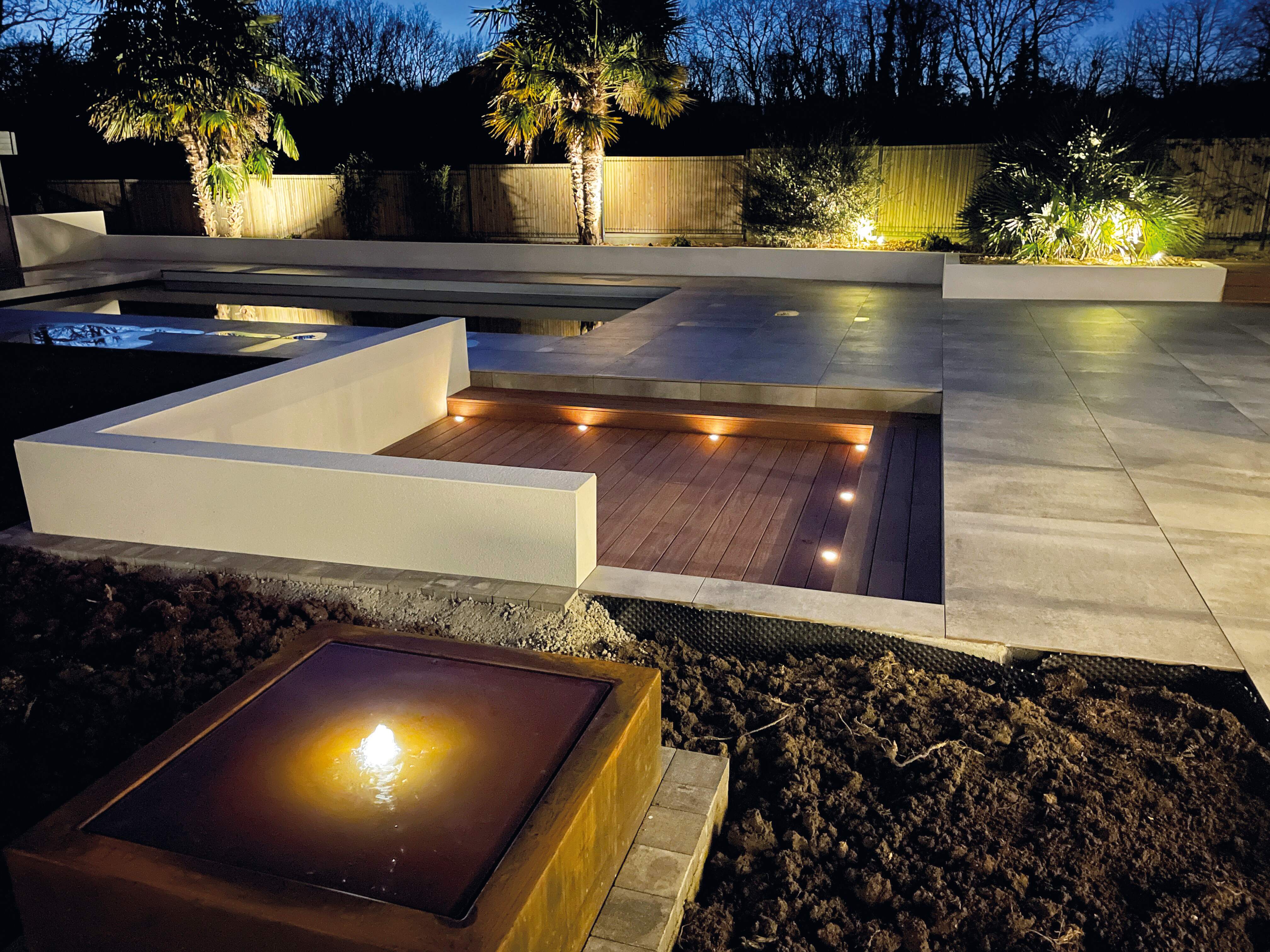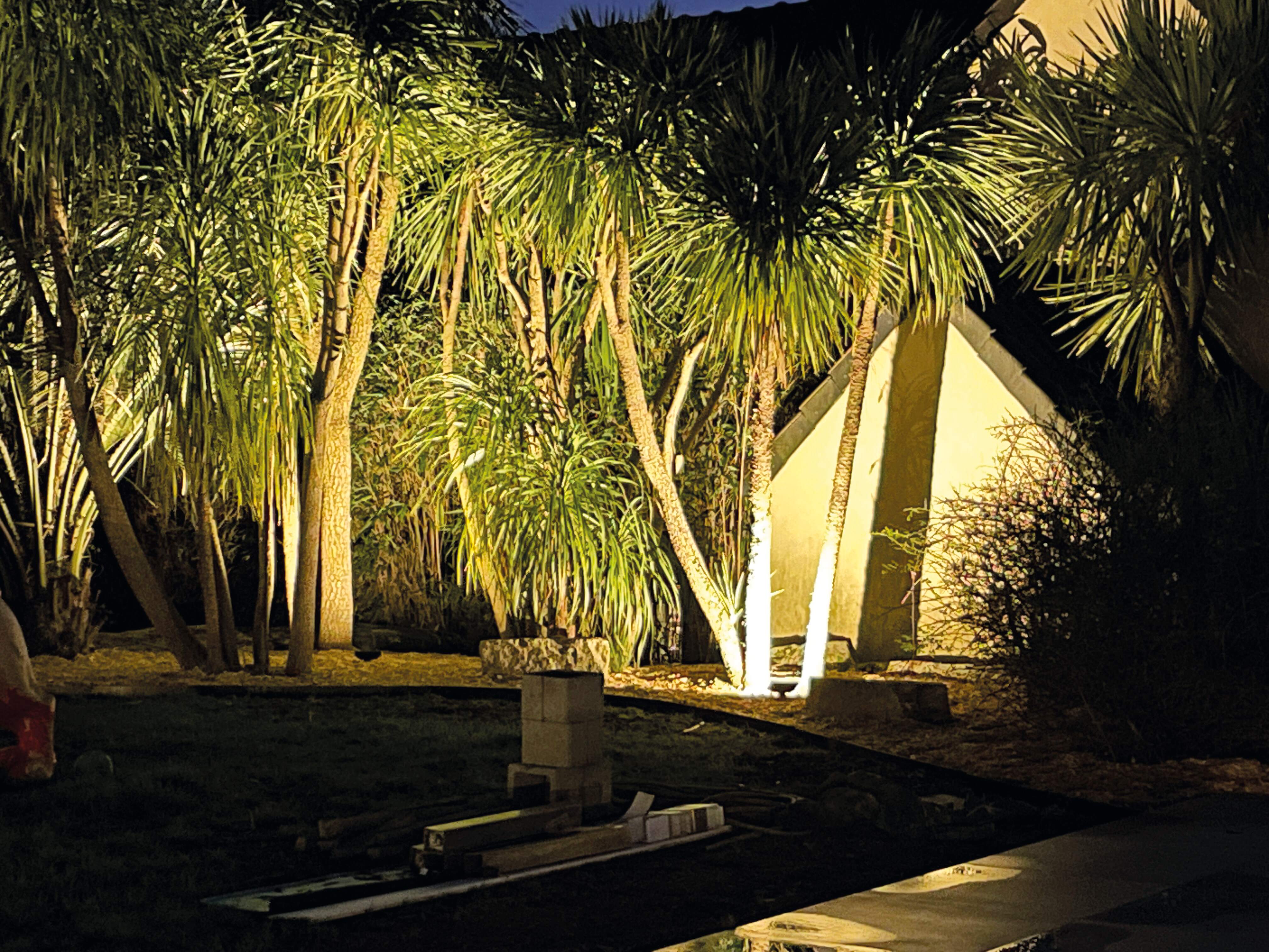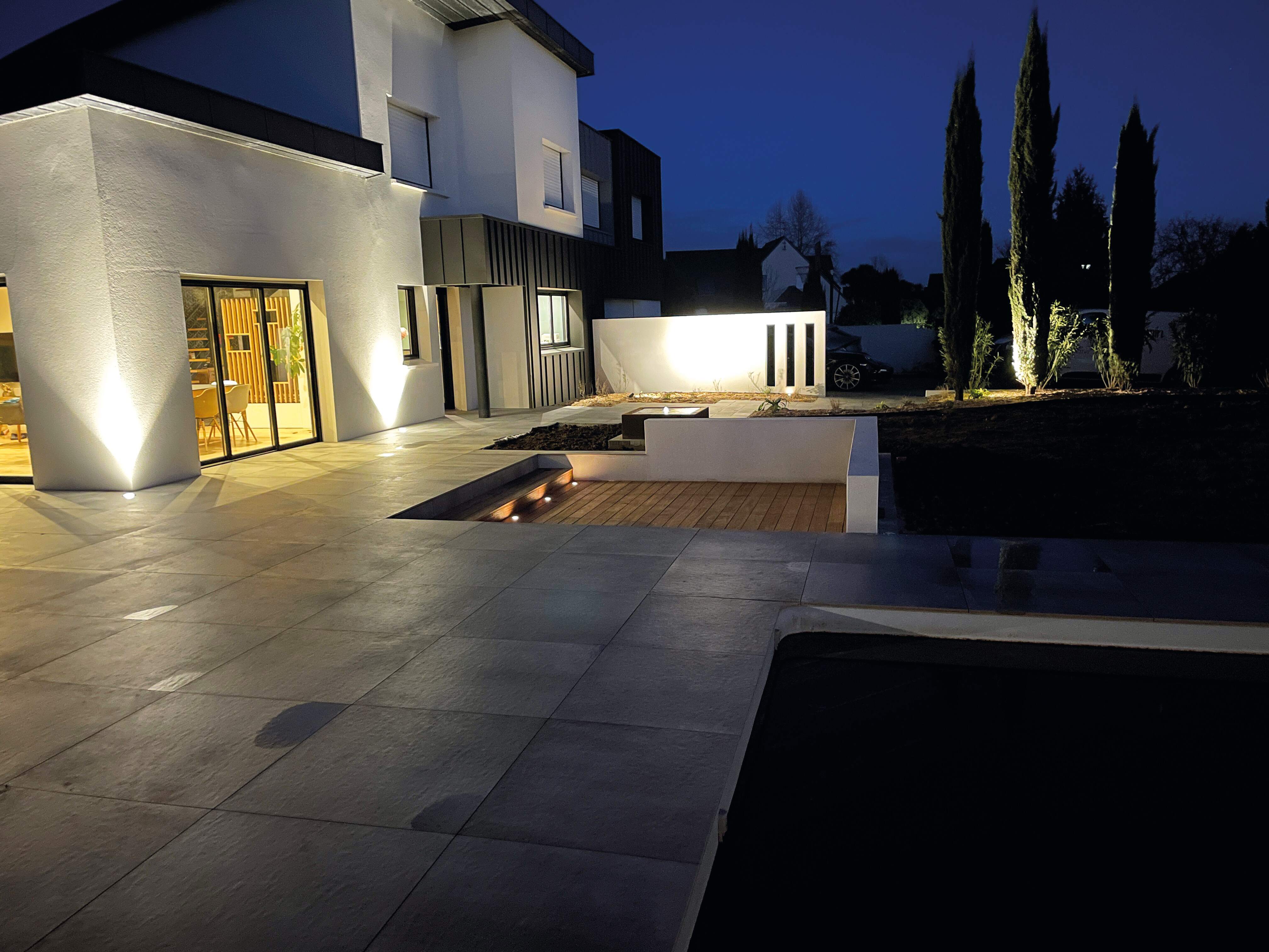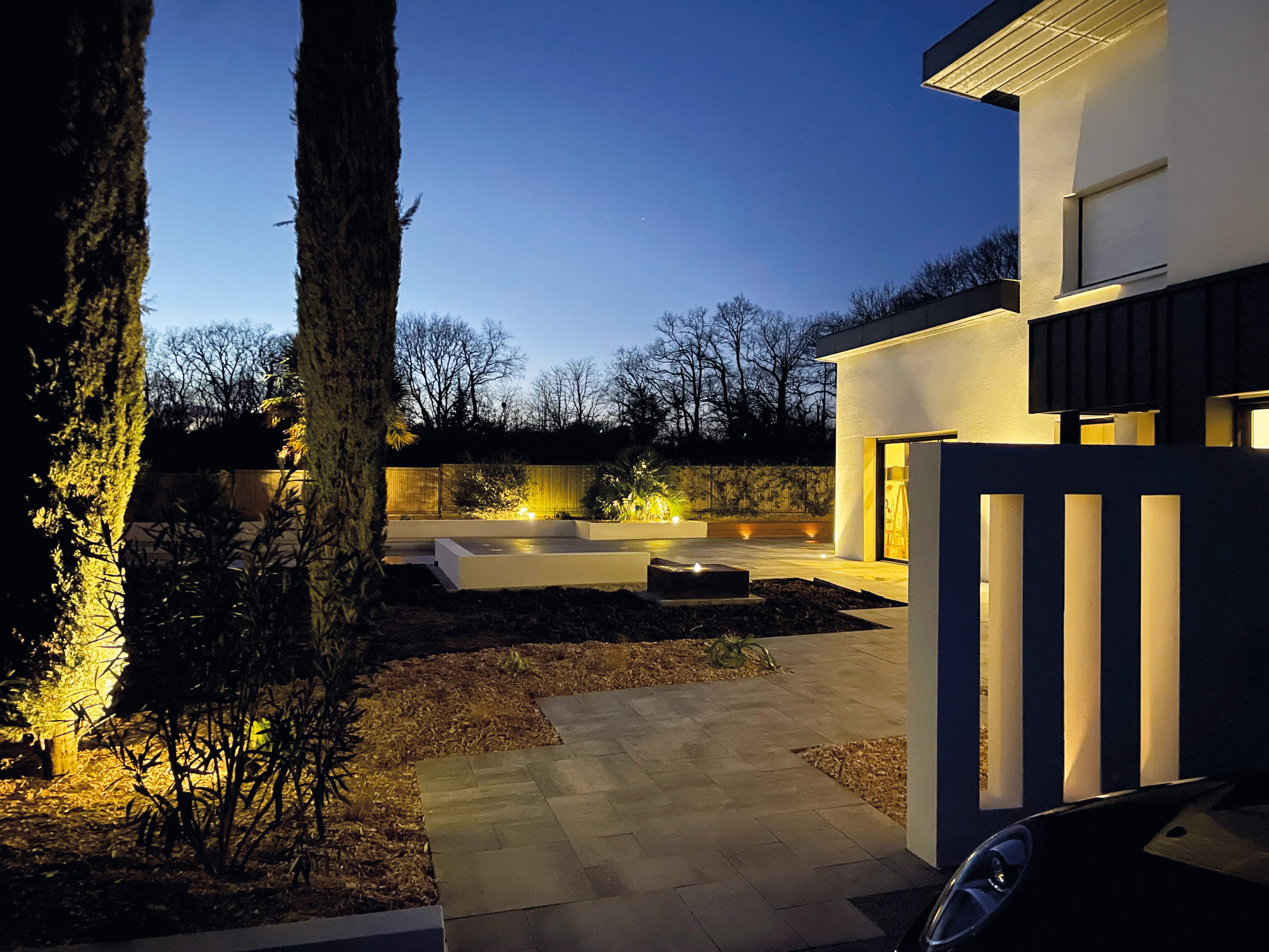 L’installation d’éléments d’éclairage extérieur positionnés dans les végétaux, dans le coin salon encastré et aux abords de la maison (sur dallage) apportent non seulement une ambiance dans le jardin, mais contribuent également à la sécurité.