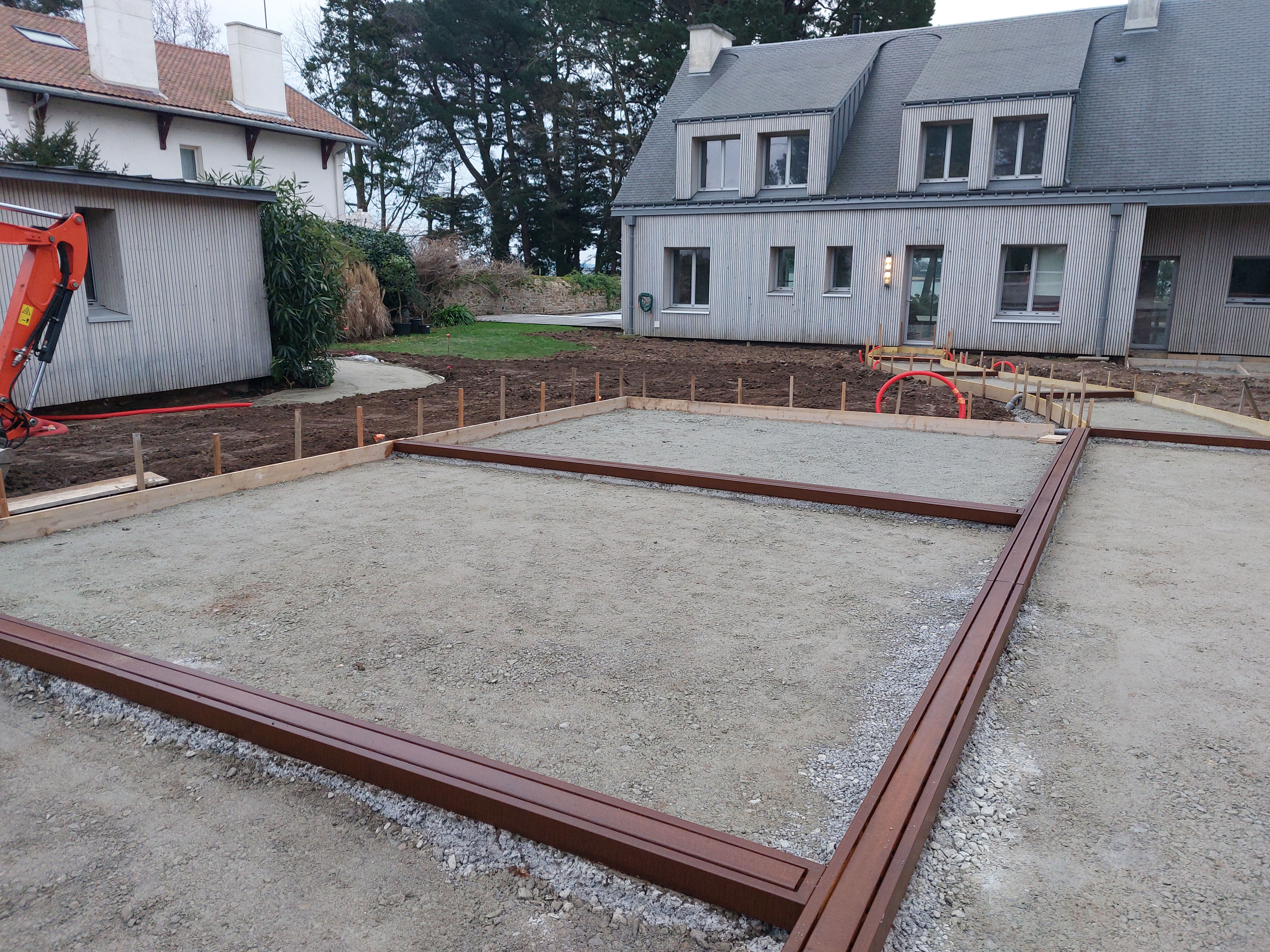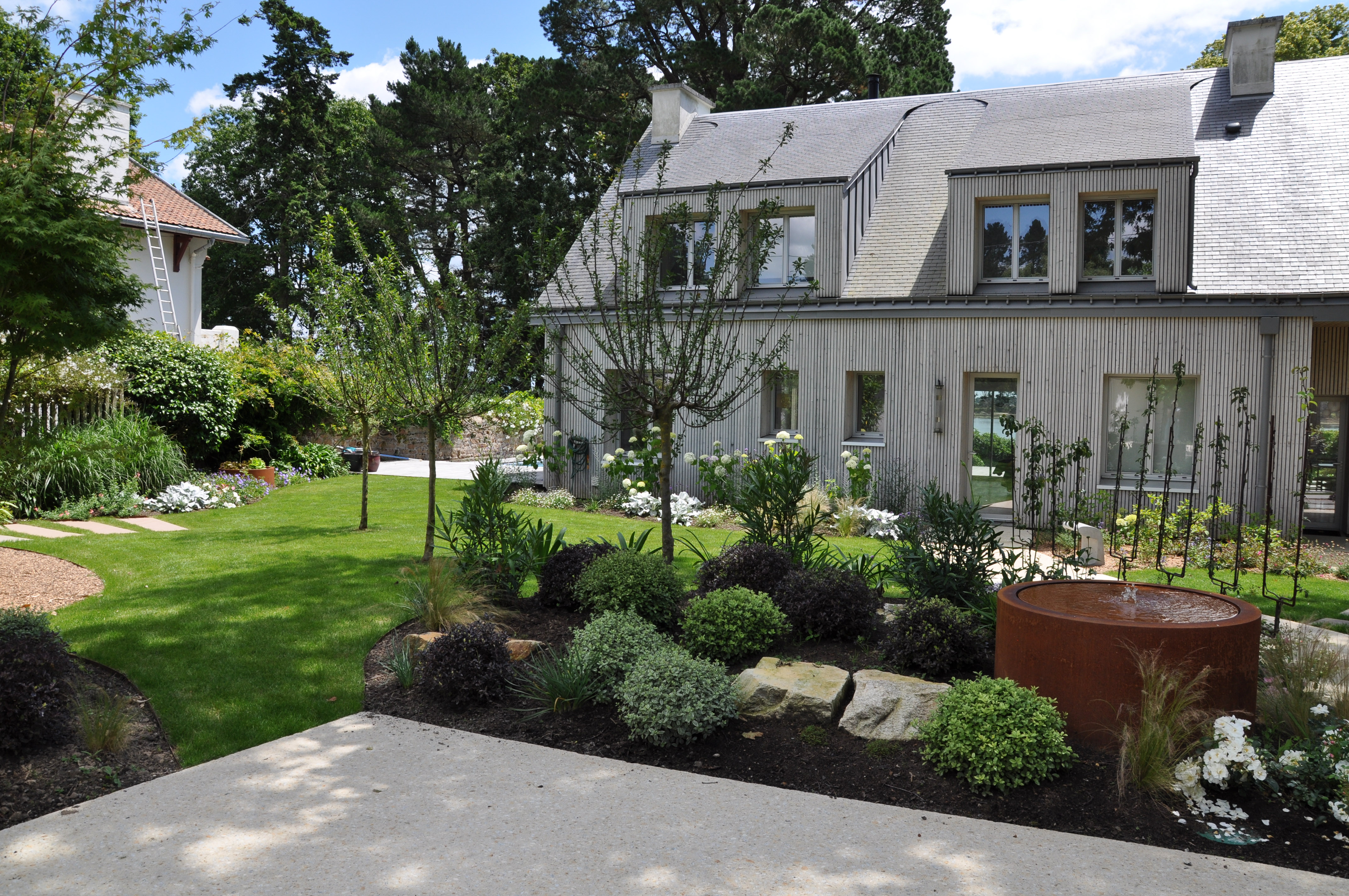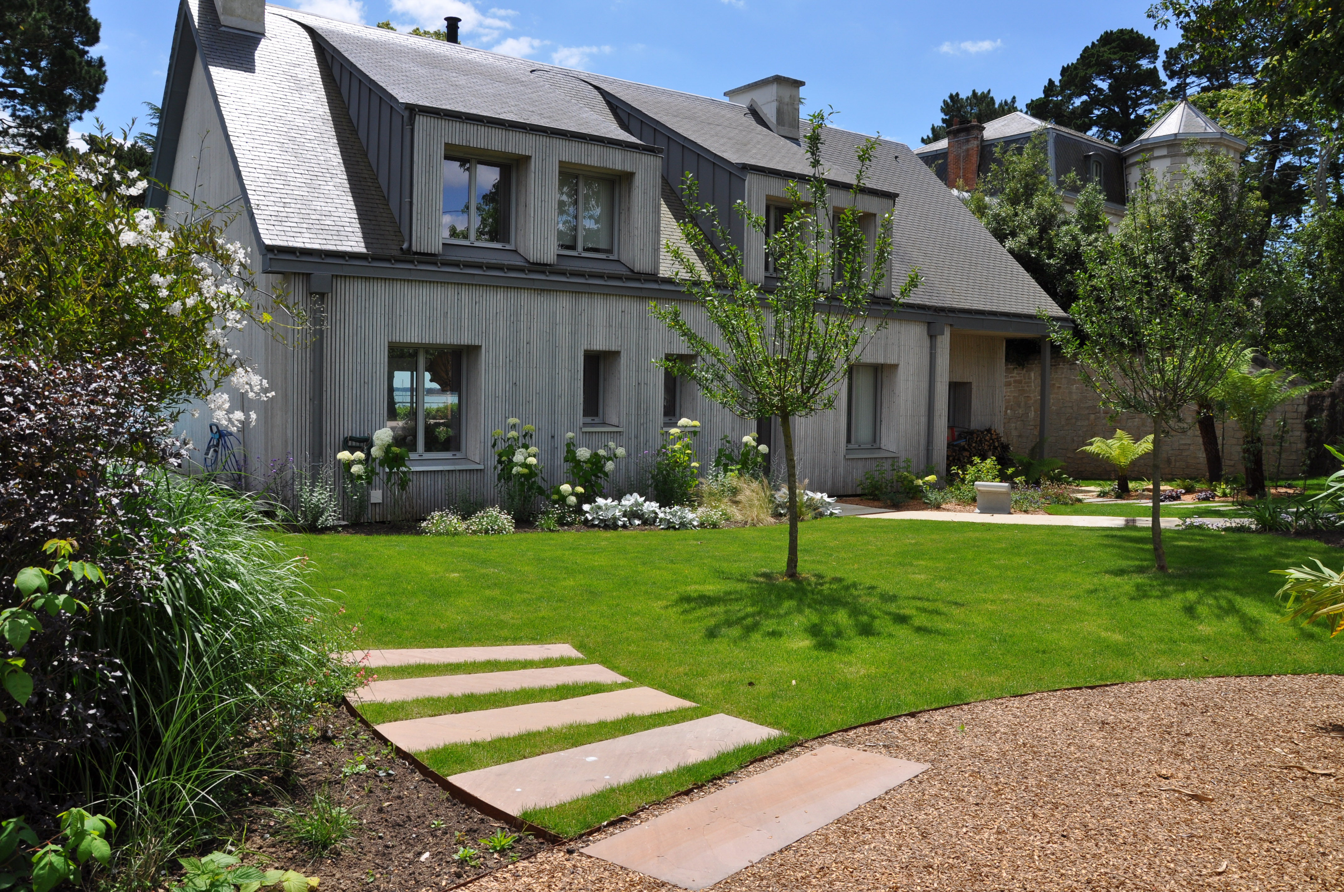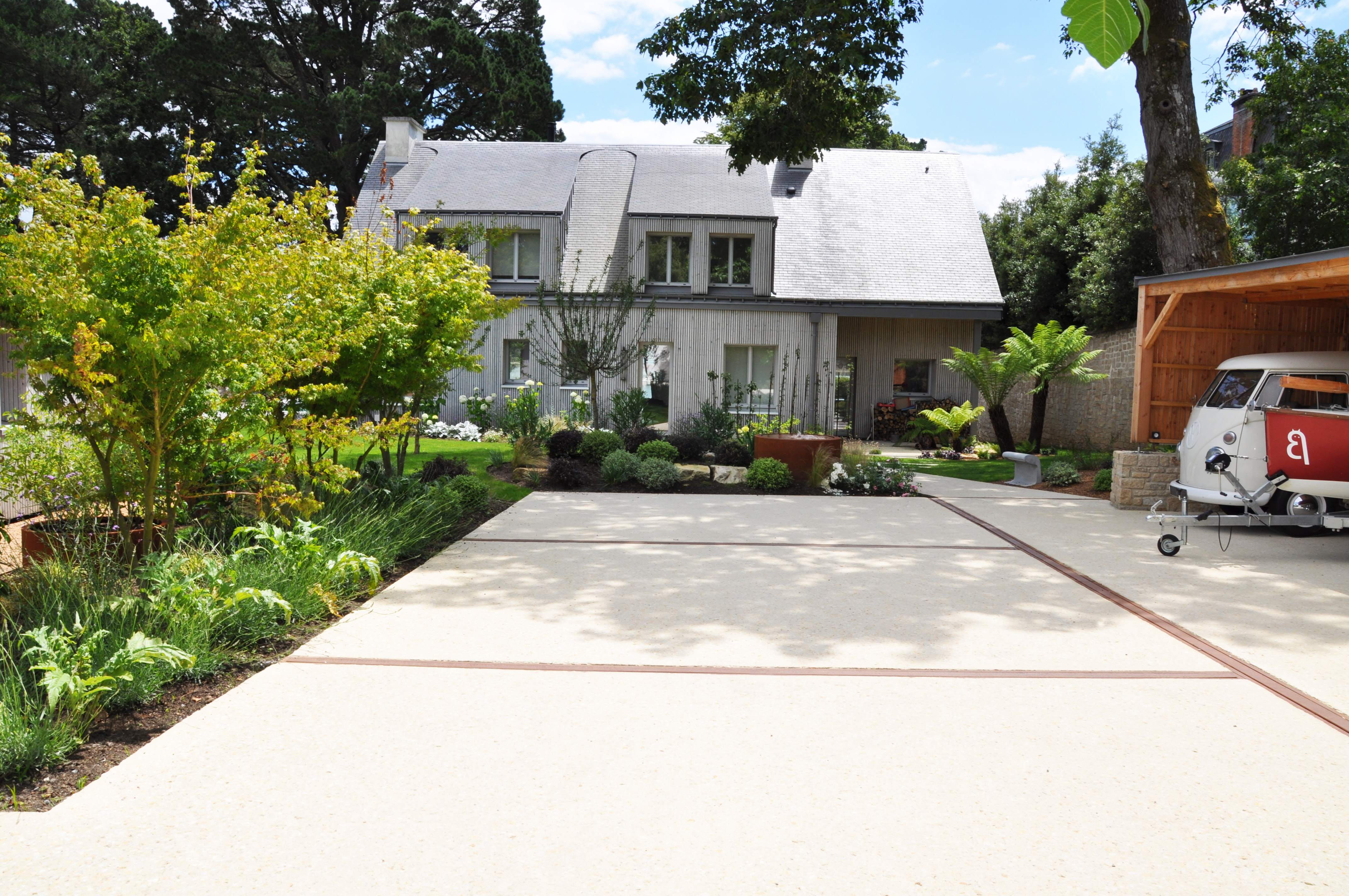 Conception et réalisation d'aménagements paysagers pour cette maison au bord du Golfe du Morbihan : travaux de terrassement, parking et allées en béton érodé, caniveaux en corten, nidagravel, pas japonais en grès, muret en pierre à l’ancienne, fontaines et bacs potagers en corten, bordures en corten, plantations, paillage naturel et gazon de placage.