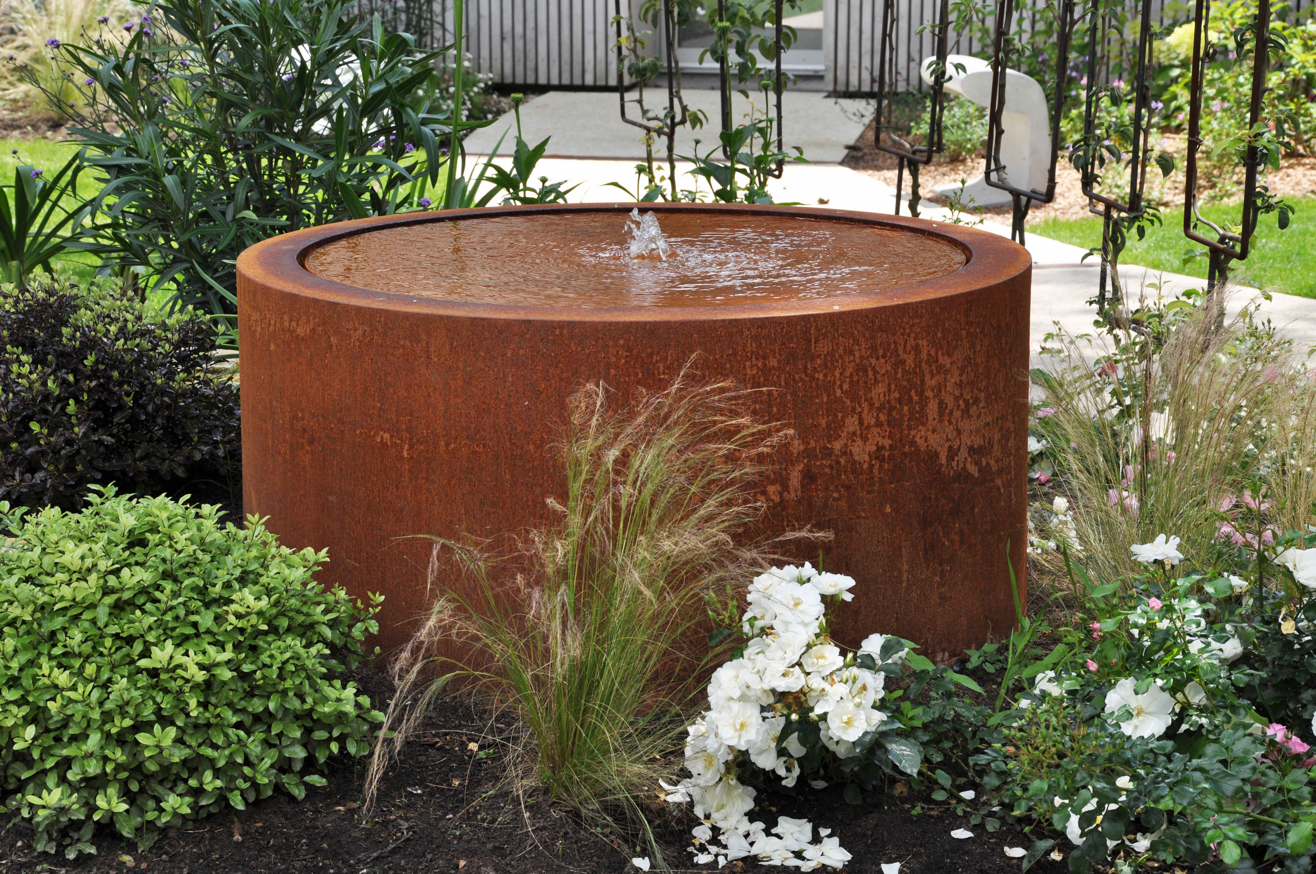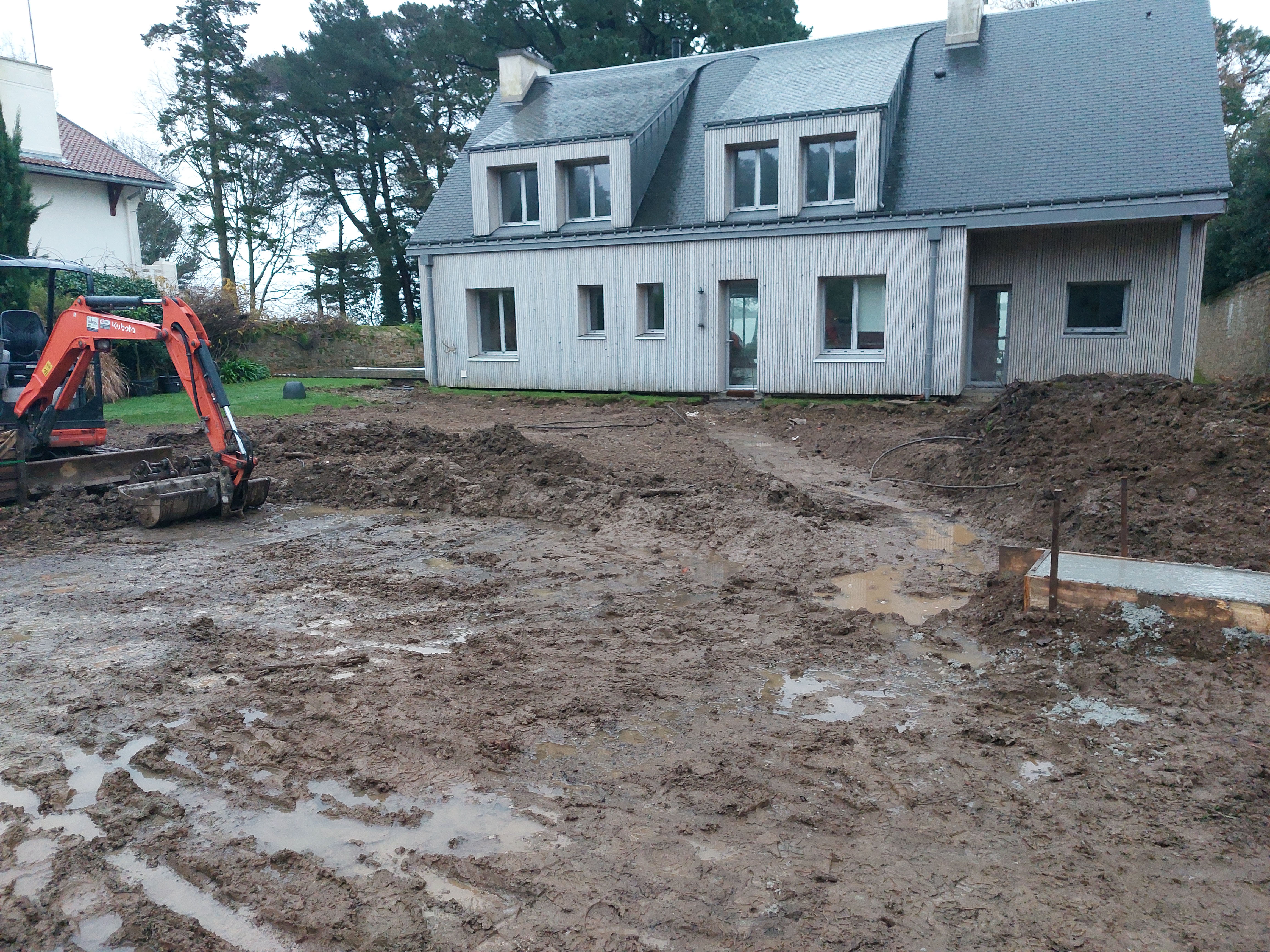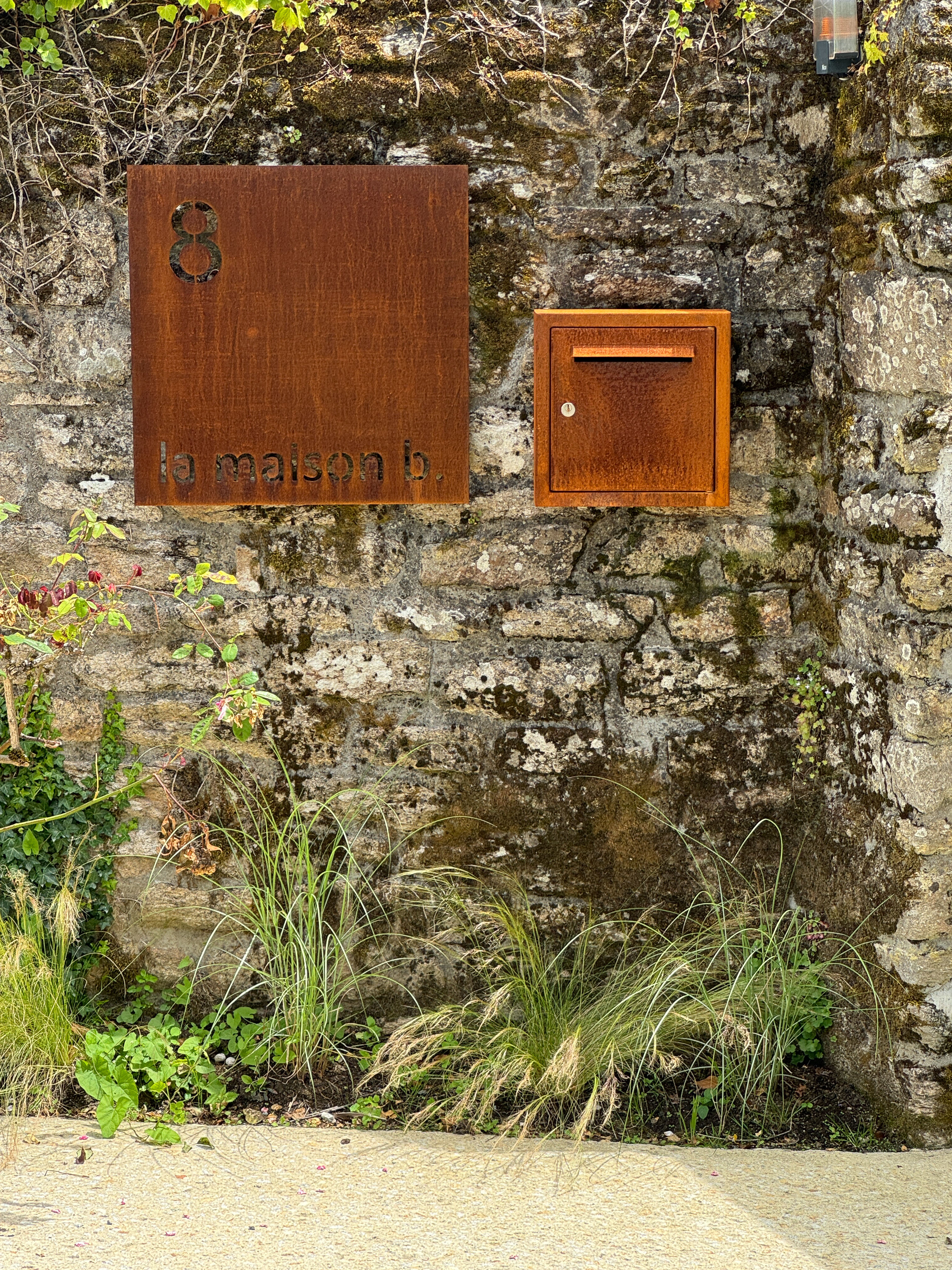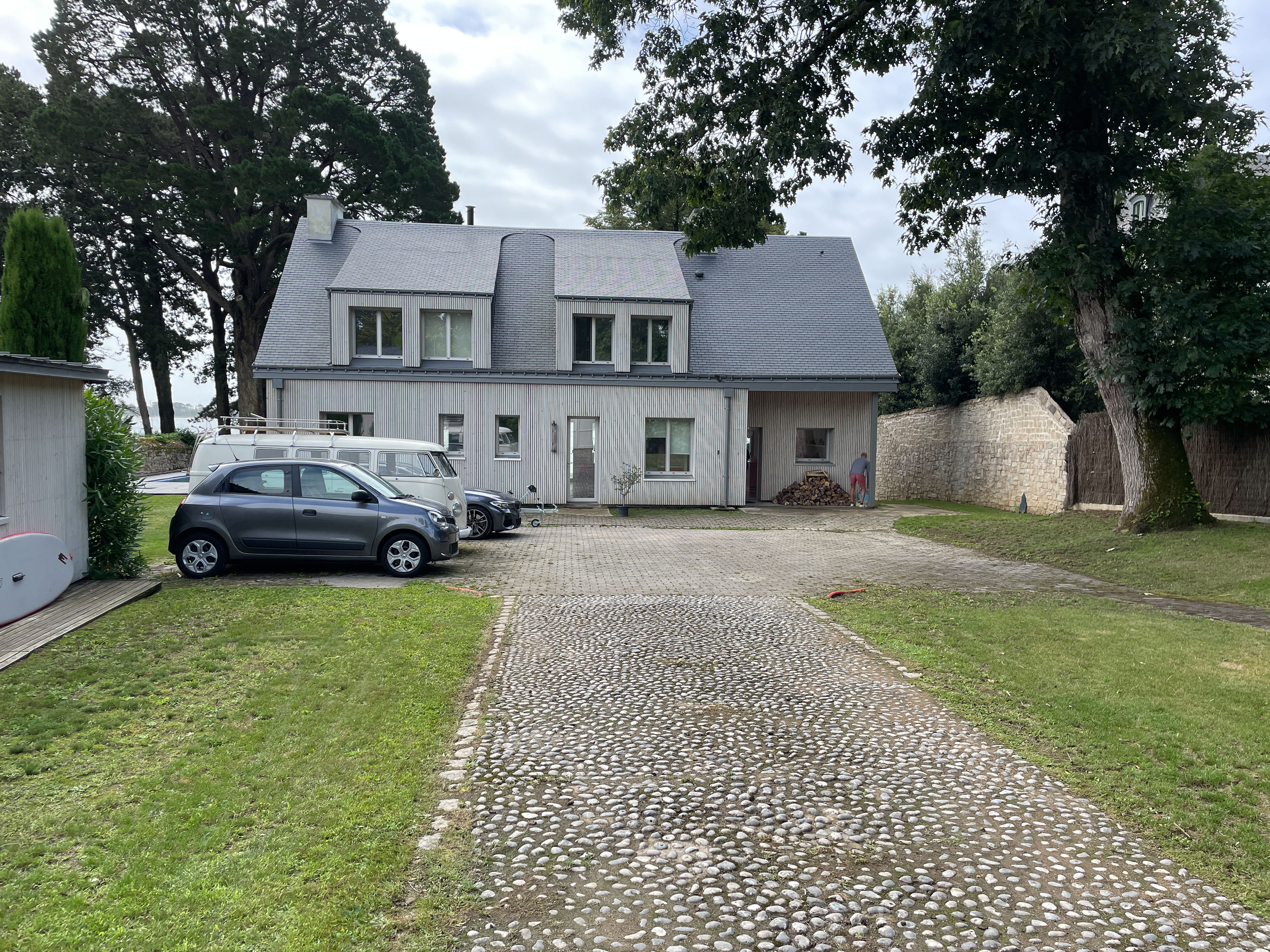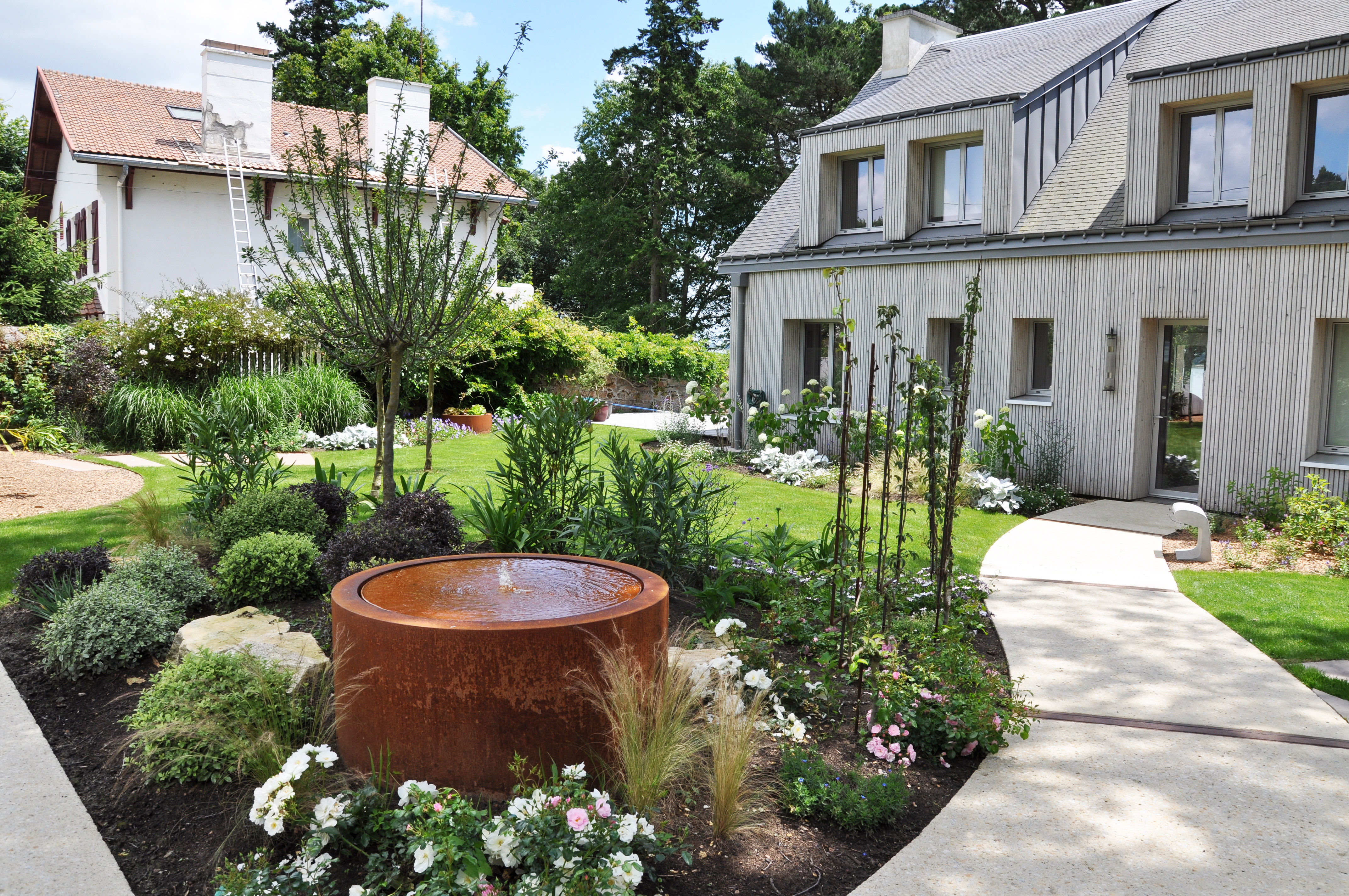 Conception et réalisation d'aménagements paysagers pour cette maison au bord du Golfe du Morbihan : travaux de terrassement, parking et allées en béton érodé, caniveaux en corten, nidagravel, pas japonais en grès, muret en pierre à l’ancienne, fontaines et bacs potagers en corten, bordures en corten, plantations, paillage naturel et gazon de placage.